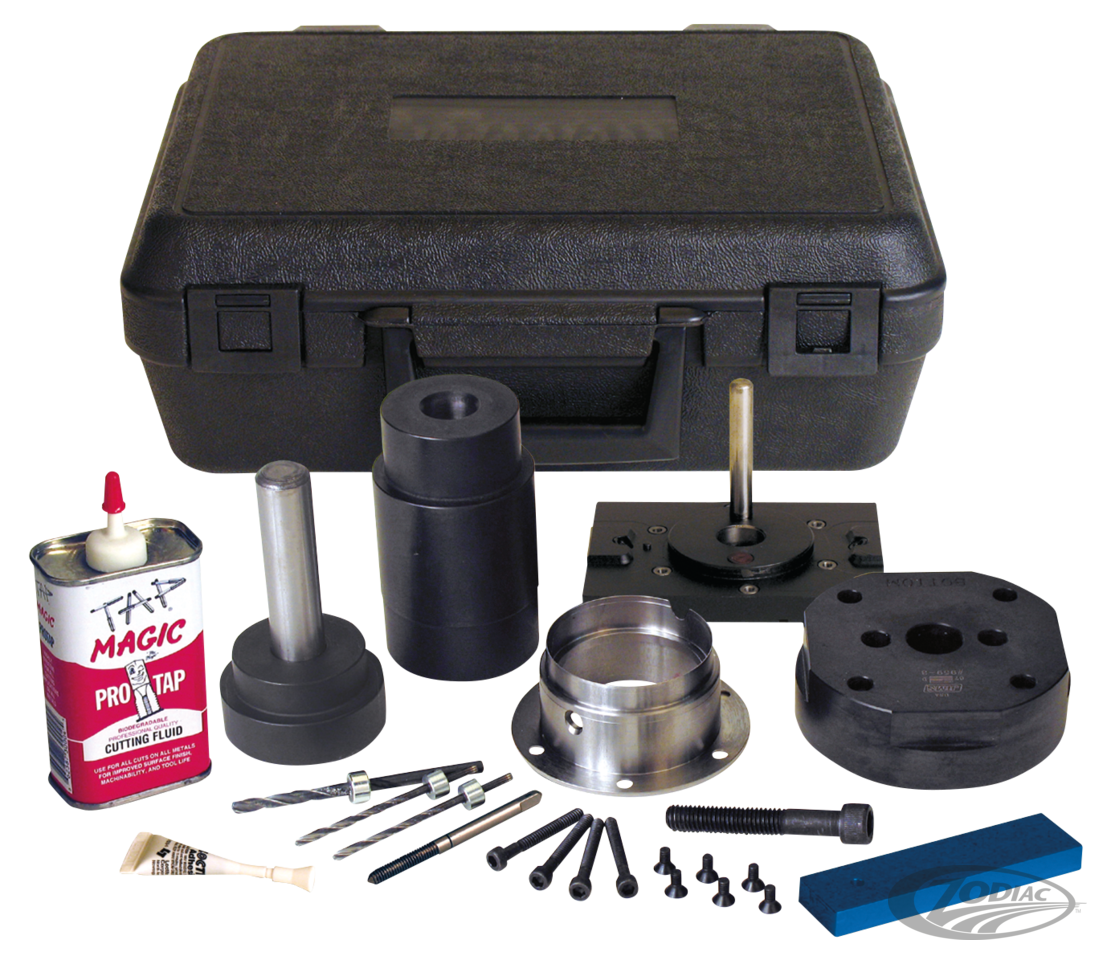 This tool is a must for the big cubic inch late model Twin Cam engine builder. It may also be used to replace bearing for stock 88" or 96" engines. Utilizing the special JIMS precision insert, it is designed to easily and accurately convert the left side crankshaft roller bearing (OEM 24604-00D) to the more durable Timken bearing (OEM 9028). This insert is manufactured from aerospace quality steel that is several times stronger than the aluminum case material the standard bearing rides in. This job can be performed with normal hand tools, a hand drill and a 2 ton press. Includes: •A steel bearing insert held to under .0002" total indicator reading. •A press plate that will hold the bearing insert in line with the case bearing bore at the time it is being pressed into case •All the necessary drill bits to drill oil feed and return holes, hardware, and detailed instructions Timken style crankcase bearing must be ordered separately.