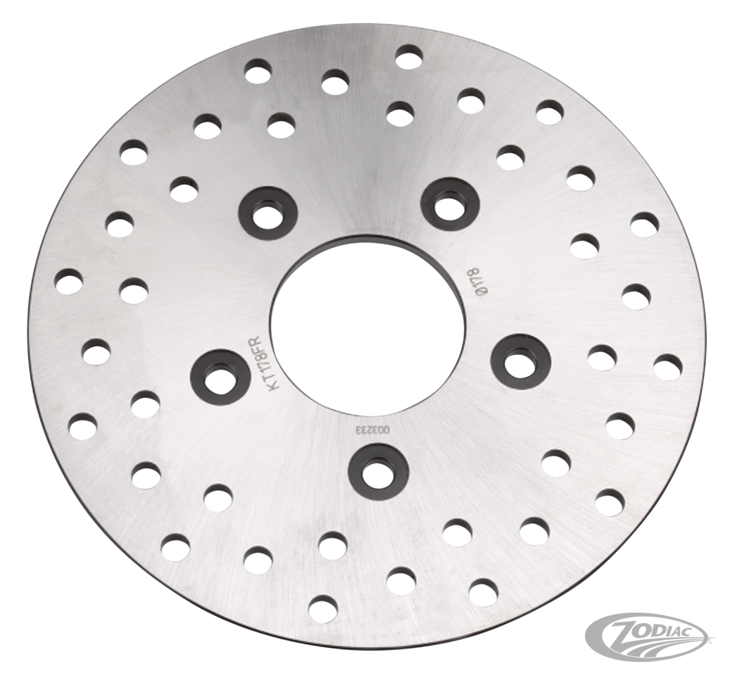 For those who think the stock 11.5" (292mm) discs are an eyesore and too large for their bike project, Kustom Tech now offers 8.5" (216mm) and 7" (178mm) diameter discs. These discs fit 1984 thru 1999 Evolution style 2" (50.4mm) center hubs using 5/16" counter sunk mounting bolts. Stainless steel so these will work with the OEM calipers, but requires custom made caliper brackets. Discs are sold each.
