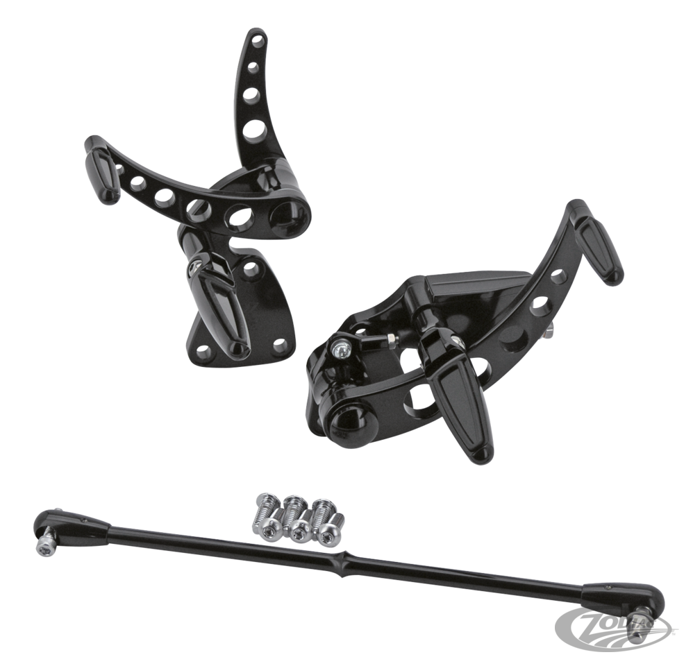 These forward controls are another great looking product from Kustom Tech. The sleek design of the master cylinder will perfectly match with Kustom Tech's contoured handlebar controls. The shift and brake peg as well as the footpegs have a rubber inlay that will prevent your feet from slipping of. Pegs will fold for your safety and convenience. Made from billet aluminum and then polished to a mirror shine high gloss finish or satin black anodized. Set includes a banjo fitting, shifter rod and 16mm bore (.63", so just .05" bigger than commonly used 5/8" bore) rear brake master cylinder. These forward controls require a separate kickstand like ZPN 741128.