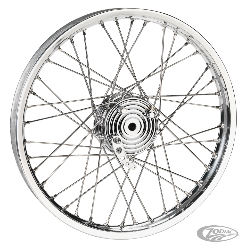 Mini front drum brake for custom bikes. Features an 80mm wide chrome plated cast iron drum. The cooling fins on the drum help to dissipate heat and yield a nostalgic look. Drum has an internal diameter of 130 mm, whereas the side covers are made from aluminum with a polished finish. Comes with bearings for use on 3/4" wheel axles installed. Special spokes for use with 40-hole 21" rims, and anchor brackets are separately available. Note: Due to its small size the braking power will only be sufficient for lightweight and stripped bikes.
