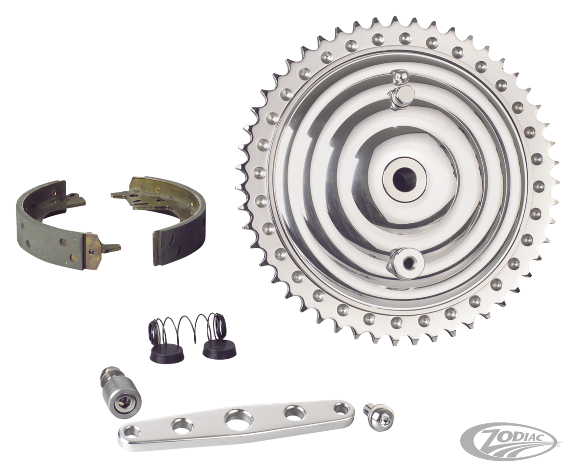This hydraulic drum will give an absolute radical and retro style to your bike, reminding of the Rodder drums of the 1950s. The central part is built from cast iron and comes with a crown of 51 teeth inside the front plate. The brake shoes are anchored like on the 1958 thru 1962 Harley models and are activated by hydraulic cylinders. On the back brass fins are screwed around the drum, offering a special look and excellent cooling as well. The drum is supplied with a perforated aluminum anchor rod that requires a mounting tab to be welded to the frame. Available in all chrome, or chrome with polished brass fins.