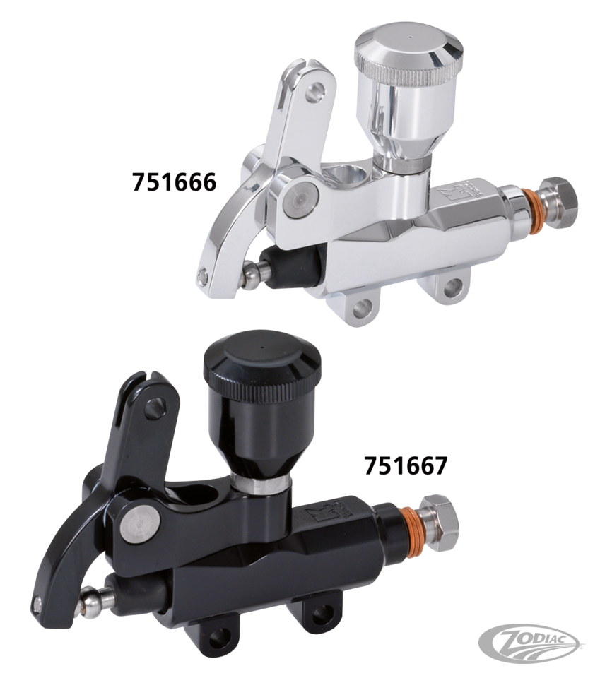 Machined from billet aluminum in a very small and smooth design, these wire-operated master cylinders will clear up the space on your handlebar for a clean and smooth look. Featuring a 14mm bore, available with or without integrated fluid reservoir and comes in polished or black finish. Requires cable type handlebar controls.