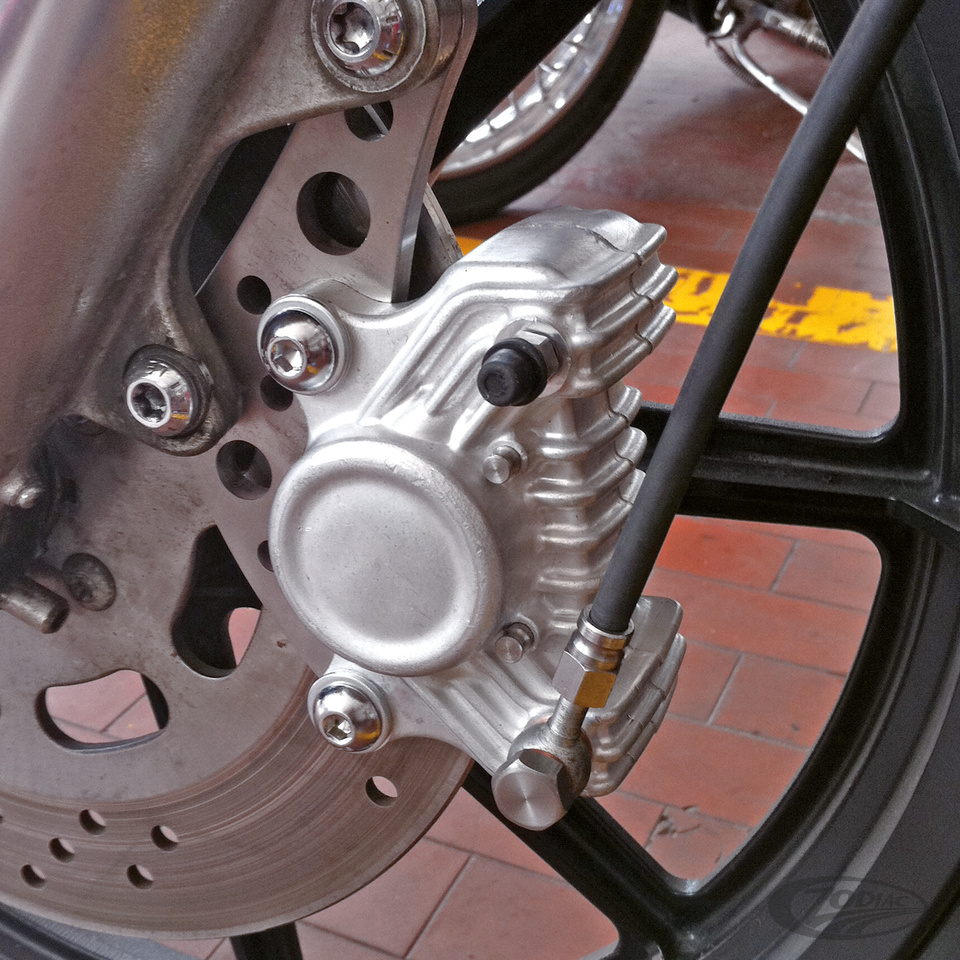 Made from forged aluminum for superior rigidity and CNC machined for precise tolerances and superior braking performances, the Super Freni 2-piston caliper will give your brakes a real nostalgic look. Matches perfectly with the K-Tech Deluxe handlebar controls found elsewhere in our catalog. Calipers are available in shiny polished or raw aluminum finish and come with brake pads and banjo bolt. Center to center distance measures 3.25" (8,25cm), caliper width is 3" (7,6cm) and center of the caliper to the inside is 1.5" (3,8cm). Matching stainless steel caliper brackets are available for use with 11 1/2" disc brake rotors in selected applications or must be custom made. Note: This caliper is not guaranteed to fit stock or custom wire wheels in Narrow Glide applications.