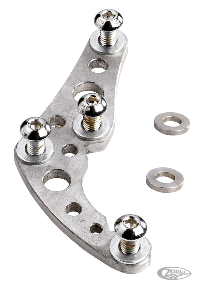 Made from forged aluminum for superior rigidity and CNC machined for precise tolerances and superior braking performances, the Super Freni 2-piston caliper will give your brakes a real nostalgic look. Matches perfectly with the K-Tech Deluxe handlebar controls found elsewhere in our catalog. Calipers are available in shiny polished or raw aluminum finish and come with brake pads and banjo bolt. Center to center distance measures 3.25" (8,25cm), caliper width is 3" (7,6cm) and center of the caliper to the inside is 1.5" (3,8cm). Matching stainless steel caliper brackets are available for use with 11 1/2" disc brake rotors in selected applications or must be custom made. Note: This caliper is not guaranteed to fit stock or custom wire wheels in Narrow Glide applications.