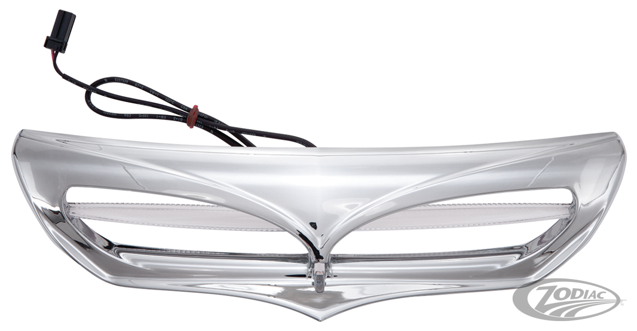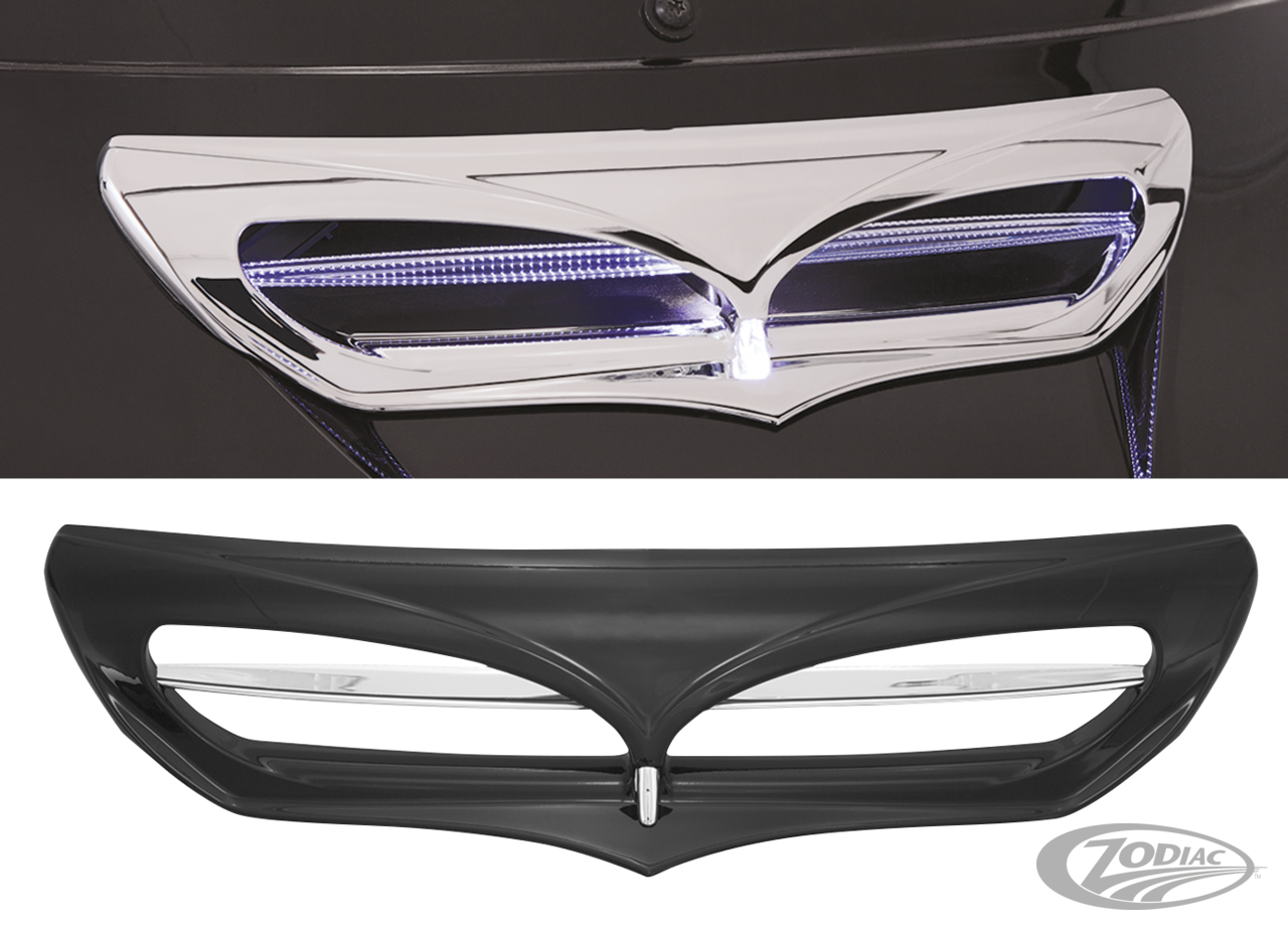 Ciro has designed the most appealing and innovative fairing vent trim on the market today. The LED lighted version features light pipe technology that creates a mesmerizing effect. The vent trim will not affect the flow of the fairing vent. Made out of ABS and comes with 3M automotive grade adhesive for easy installation. The LED light module plugs directly into the stock wiring harness with no cutting, drilling, or splicing. Fits all 2014 to present Harley-Davidson Electra Glide, Street Glide, Tri Glide and Ultra Limited models with an OEM Batwing fairing