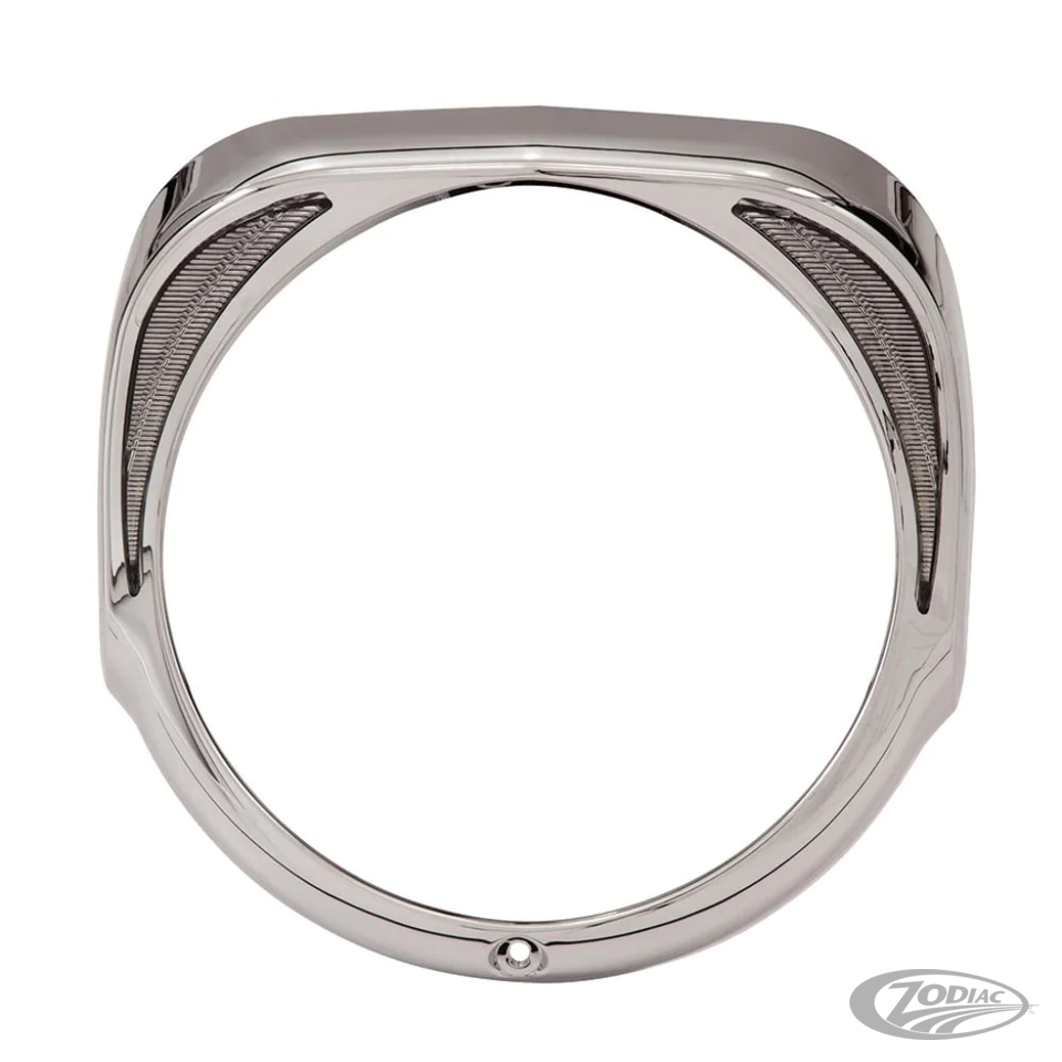 Add some fangs to the front of your bike with the Ciro Headlight Bezel. This new design is sculpted to perfectly fill the space around your headlight for a streamlined look. This bezel also features custom fang-shaped bright white LED running lights that automatically turn on and off with your headlight. Fang headlight bezels for Road Glides also feature amber turn signals. Easy to install, includes everything you need to mount and plug into your accessory port with no cutting, drilling, or splicing. Easily removable light housings make painting to color match easy.