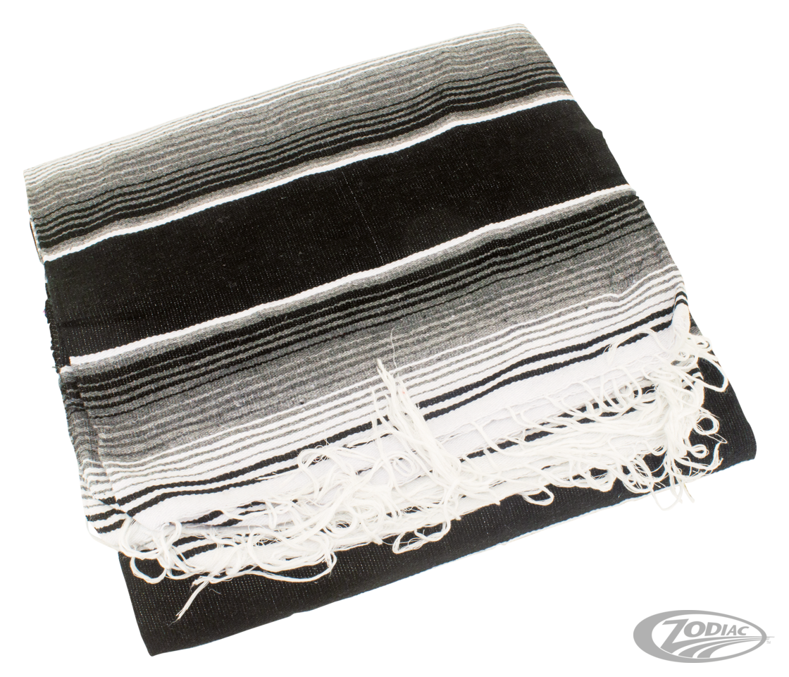 Authentic Made in Mexico sarapes, serapes, saltillos or Mexican blankets. Cozumel style blankets are made of an Acrylic with cotton and polyester blend, measuring 59"x84" (150x213cm). Veracruz style blankets are 100% Acrylic and measure 52"x80" (132x203cm). Available with or without Genuine Leather blanket holder that you can tie to your handlebars, sissy bar or you name it. Blanket holders have straps with 22" (56cm) useable length and can also be used for sleeping bags.