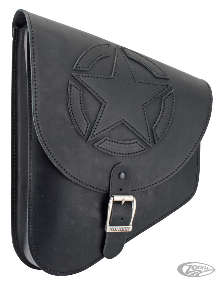 Fits all Softail 1984 to present, except those with cross-over exhaustFront height 14 1/4" (36cm), rear height 6 1/4" (16cm), 10" (26cm) long and 3 1/2" (9cm) deep, capacity 3.7 litres, Black leather with star
