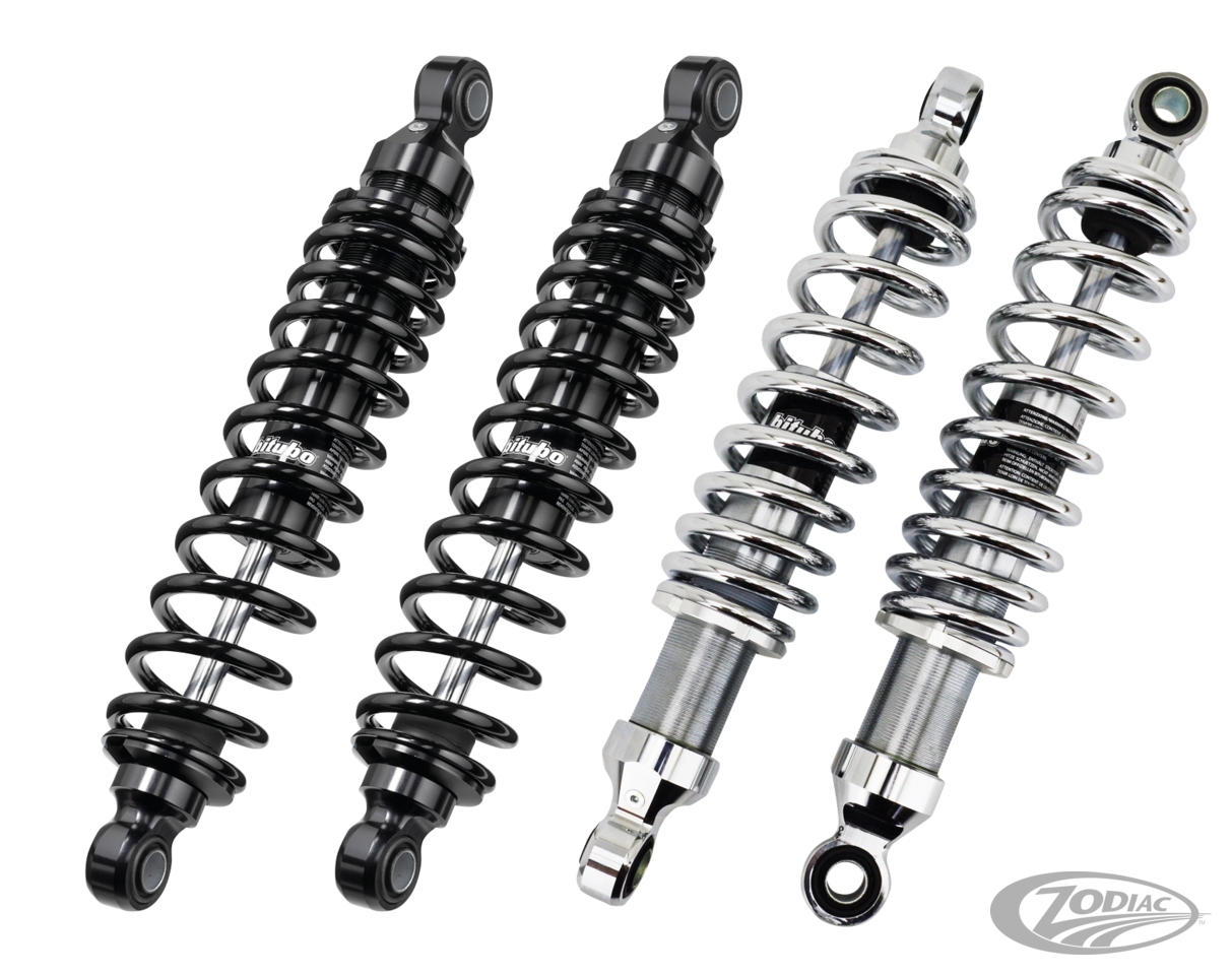 Designed and made in Italy. Bitubo WMB series Nitrogen filled hydraulic shocks improve riding comfort and vehicle control. Most significant is that the damper units are fitted "upside down". These shocks feature adjustable spring preload and are available for most Harley models. Spring covers are available as an accessory. Your model motorcycle is given together with the stock shocks length. Feel free to take longer or shorter shocks from the same application group, but note that shorter than stock shocks lower the rear of the motorcycle. Fender to tire clearance should be checked after installation. Changing shock length will also change handling of your bike.