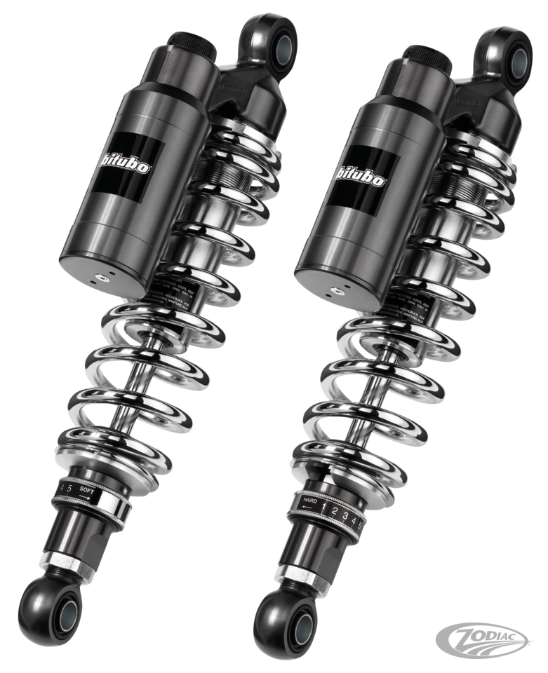 High Performance shock absorbers with a high resistance alloy steel housing, Nitrogen filled aluminum compensator reservoirs, hydraulic damping and 12mm steel damper rods. They feature 12-step adjustable compression and adjustable spring pre-load. Adjustable spring pre-load on the DeLuxe WMT22V2 shocks feautures a hydraulic mechanism that allows easy adjustment with a common box wrench or using the optional tool. The Bitubo Piggy Back shocks for V-Rod are adjustable up to .400" (10mm) in length. Sold in pairs.