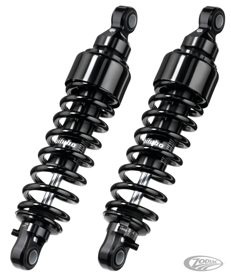 Designed and made in Italy. Bitubo WMB series Nitrogen filled hydraulic shocks improve riding comfort and vehicle control. Most significant is that the damper units are fitted "upside down". These shocks feature adjustable spring preload and are available for most Harley models. Spring covers are available as an accessory. Your model motorcycle is given together with the stock shocks length. Feel free to take longer or shorter shocks from the same application group, but note that shorter than stock shocks lower the rear of the motorcycle. Fender to tire clearance should be checked after installation. Changing shock length will also change handling of your bike.