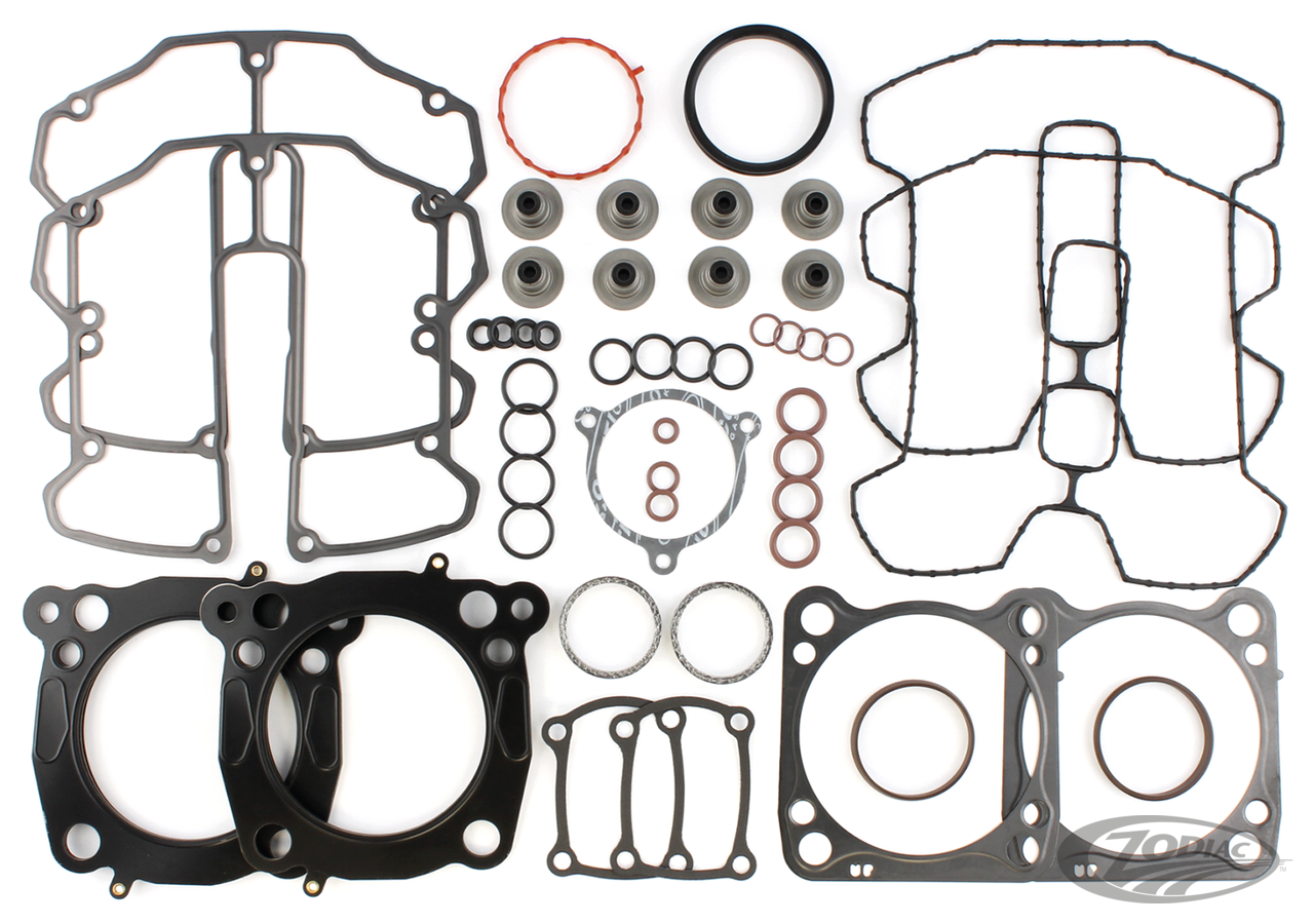 Gasket kits include all gaskets, seals and O-rings from the cylinder base thru the rocker cover gaskets. Head and base gaskets are AFM (Aluminum Foam Material), a chemically blown, compounded nitrile synthetic rubber bonded to an aluminum core with temperature resistance of over 250°F (121°C). AFM material has an 85% recovery while maintaining strong torque retention. AFM does not require gasket sealers or re-tightening. Available in stock and Big Bore sizes and various thicknesses to allow engine builders to tune compression ratio.