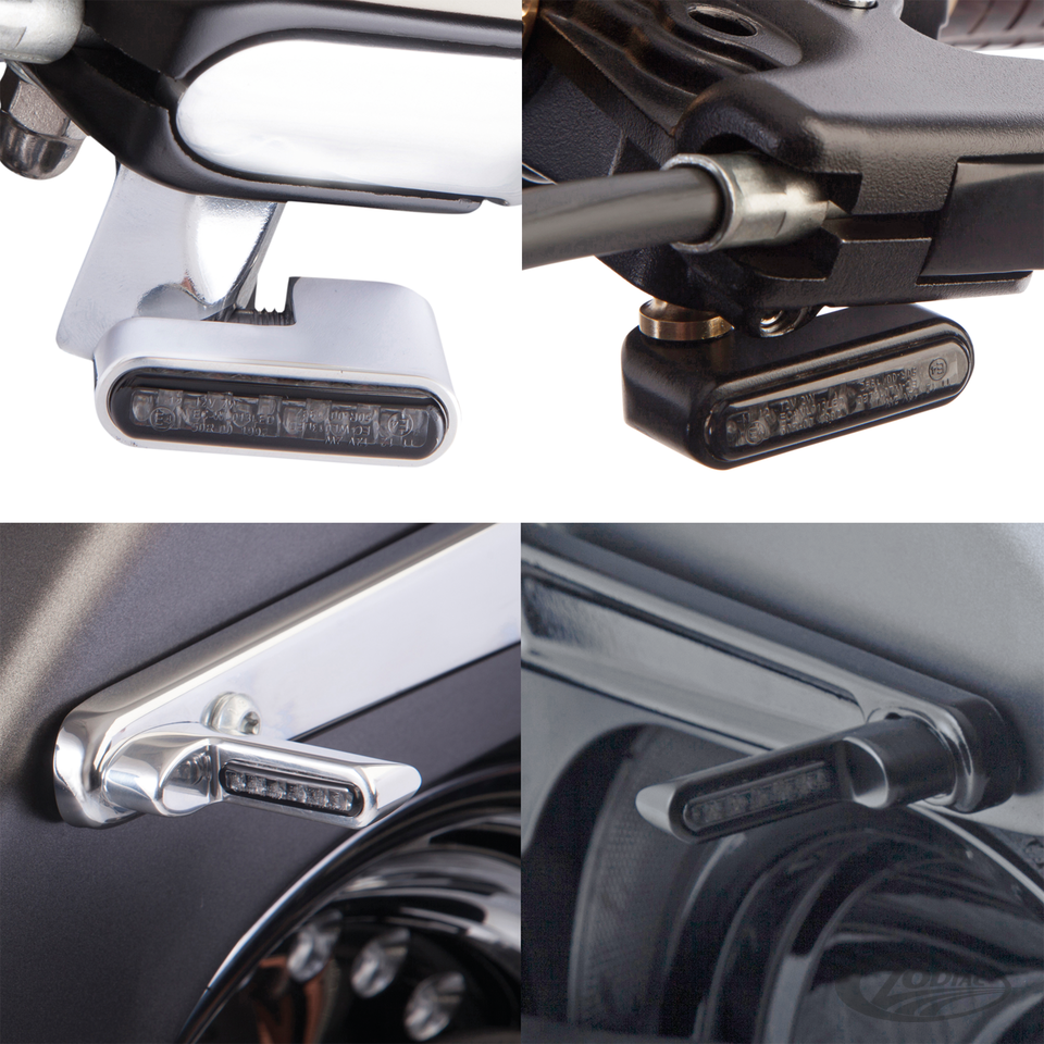 These E-approved LED turn signals are designed to be direct stock replacements for Dyna, Sportster and Softail models. Front turn signals include either a universal mounting bracket or the swivel ball as featured on stock indicators, while rear turn signals will bolt directly on the fender struts. Sold in sets of 2 and available in Chrome, Black Anodized or Brass finish, will fit most current models. Note: Except on CAN bus equipped models, LED turn signals will require an electronic turn signal relay or control module in order to blink at the correct intervals. See our Electronic turn signal flashers or Badlands Load Equalizers.