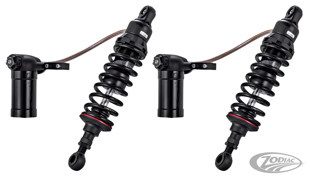 Progressive Suspension claims these are the most adjustable shock in the V-Twin market. They feature complete adjustability with a 0.4" adjustable height eyelet, rebound damping adjustment, High & Low Speed compression damping adjustment via easily accessible knobs, and threaded hand adjustable spring preload. They also feature a high-pressure monotube with deflective disc damping routed through two unique circuits delivering a consistent feel through the damper stroke for improved performance and stability. The new and improved engineered jounce bumper features a captured design to help smooth and control bottoming. Shocks come with brackets to install the remote reservoirs in front of hard shell luggage. Brackets to install the reservoirs on the top rear fender strut covers on 2009 and later Touring are available as an accessory. Shocks with Heavy-Duty springs are recommended for riders with a weight of more than 110kg or for those who ride with a passenger most of the time. Every shock is hand-built, tuned and dyno tested. Engineered for aggressive sport inspired riders, the 990 sets the mark for excellence on your V-Twin motorcycle.