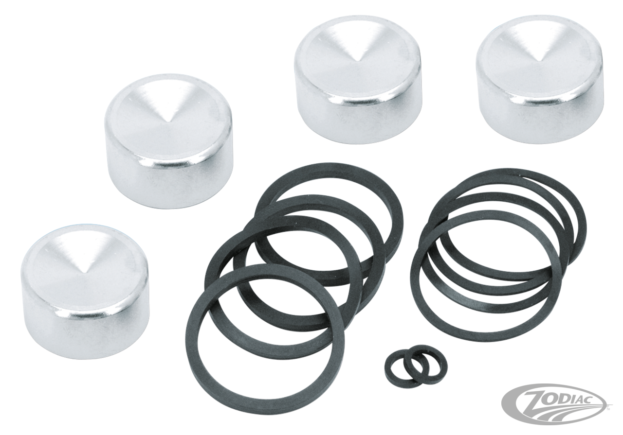 Kits with pistons and seals or sets with seals only. Fits front and rear brake calipers on all Sportster 2000-2003, Softail 2000-2007 with 41mm front forks, Touring 2000-2007, Dyna 2000-2007 and V-Rod 2002-2005. A kit or set is for one caliper.