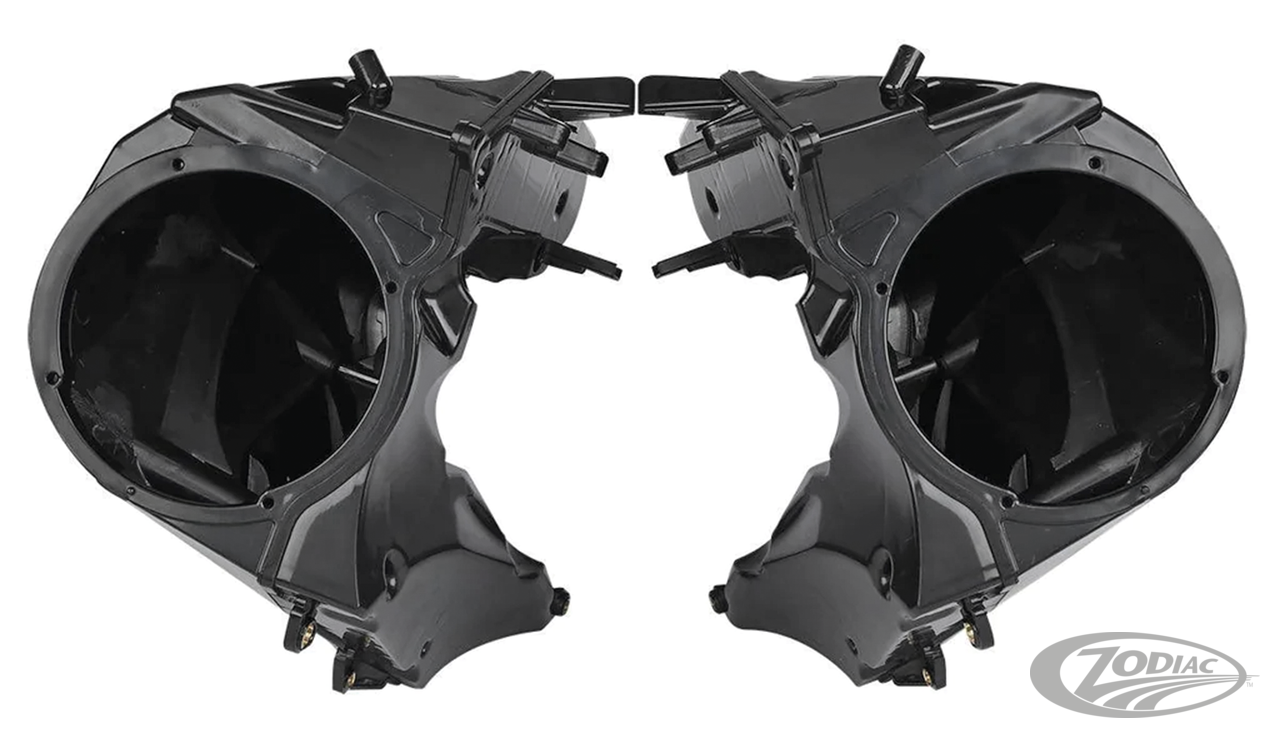 Fits FLTRK & FLTRKSE 2020-2024, FLTRU & FLTRUSE 2016-2019, FLTRT 2023-2024, FLTRX & FLTRXS 2015-2023, FLTRXSE 2018-2022, FLTRXST 2022-2023 and FLTRXP 2024, Set of left and right speaker housings, black ABS (OEM 57000172 & 57000175)