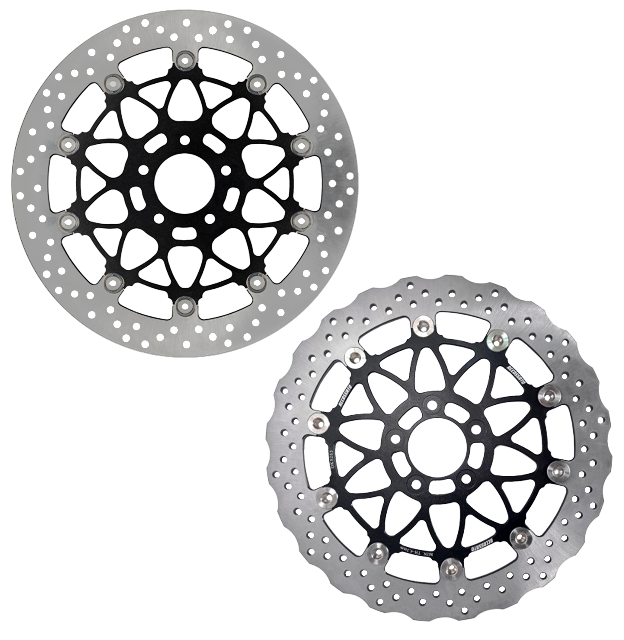 Floating brake discs, designed to offer maximum performance, safety, and braking control. Made from high-quality materials with precision machining. Available in stock diameter for those who wish to maintain the original specifications of their motorcycle while still improving braking performance, thanks to the floating structure that optimizes the alignment between disc and pads even under heavy stress. Also available in an increased diameter version, designed for sport use or for riders seeking even more powerful and responsive braking. By increasing the disc diameter, greater braking force is achieved with the same pressure on the brake lever. This results in shorter stopping distances, better control during hard braking, and improved heat dissipation. Discs come with a black center.