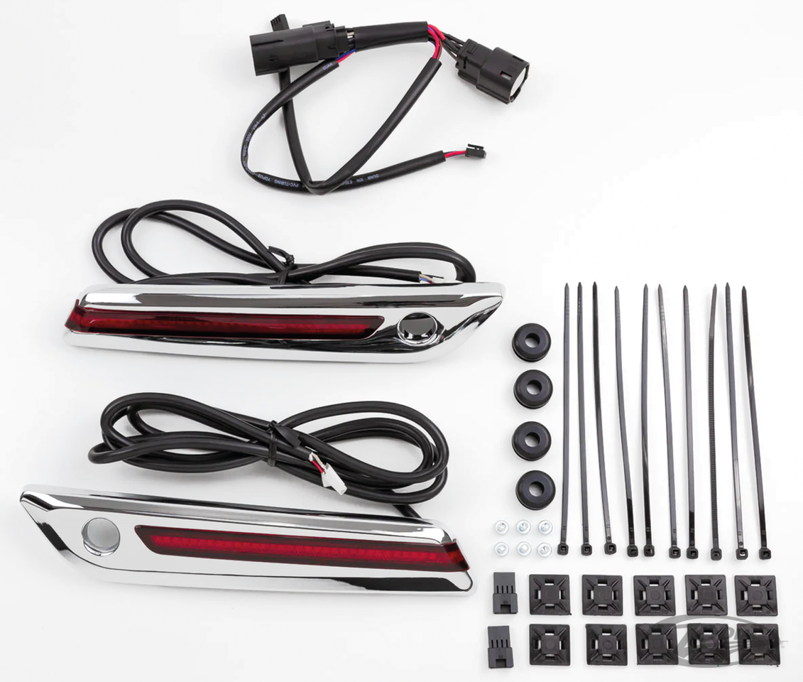 Fits all 2014 to present Electra Glide, all 2014 to present Road King, all 2014-2023 Street Glide and all 2014-2023 Road Glide, Chrome hinges with reds lens
