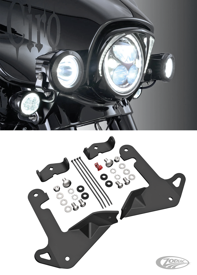Fits 2014-2023 FLHX Street Glide, FLHXS Street Glide Special & FLHXST Street Glide ST and 2015-2023 FLTRX Road Glide, FLTRXS Road Glide Special & FLTRXST Road Glide ST, TAC-10 Light Cannon kit with front fork mounts with integrated Tie Down hooks