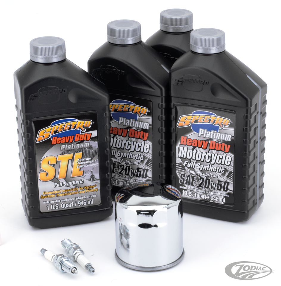 Easy does it! Just one part number to get everything you need for an engine oil change, a complete oil change or an oil change complete with a spark plugs change. We have selected for you the right type of Spectro oils, volumes, right oil filter in black or chrome and put these together in one box. We also have kits that include the correct spark plugs. And for the most demanding riders with a 2006 or later 6-speed transmission we have Platinum Plus kits available that include Spectro's special formulated noise-killing Platinum Gear oil. All kits are available with your choice of chrome plated oil filter or black painted oil filter.