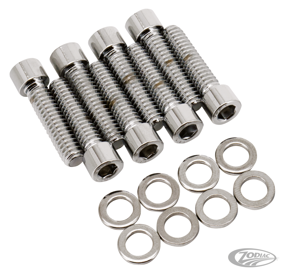 Fits Twin Cam 1999-2017, Milwaukee Eight 2017 to present and Evolution Sportster 2004-2022, Chrome socket heads, stock 1/4-20x1" UNC with lock patch, set of 8 (OEM 4741A)
