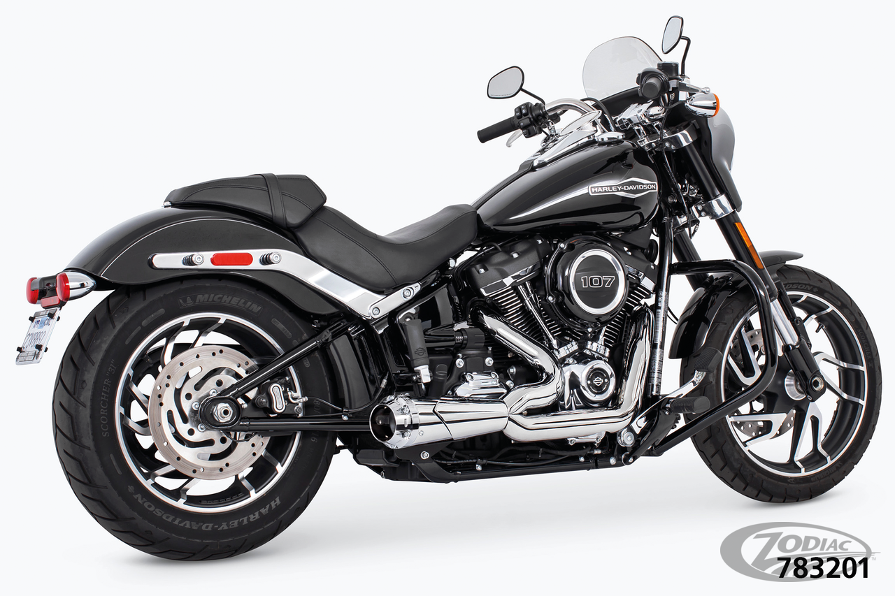 FEATURES & BENEFITS •Triple stepped headers 1 3/4" to 1 7/8" to 2" for increases of 15-18 HP and 13-15 foot lbs. of torque •Mufflers have removable baffles with a deep, rich and throaty sound, optional quiet baffles available •System equals 5 steps throughout for extreme power gains •System reduces heat concentration by 30% •Boasting full-coverage one-piece (220°) blue-proof heatshields (available in chrome or ceramic black) •Customizable with a show chrome, sculpted black or pitch black tip •Includes O2 sensor ports, plugs and all mounting hardware •Engineered for maximum power! •Made in USA