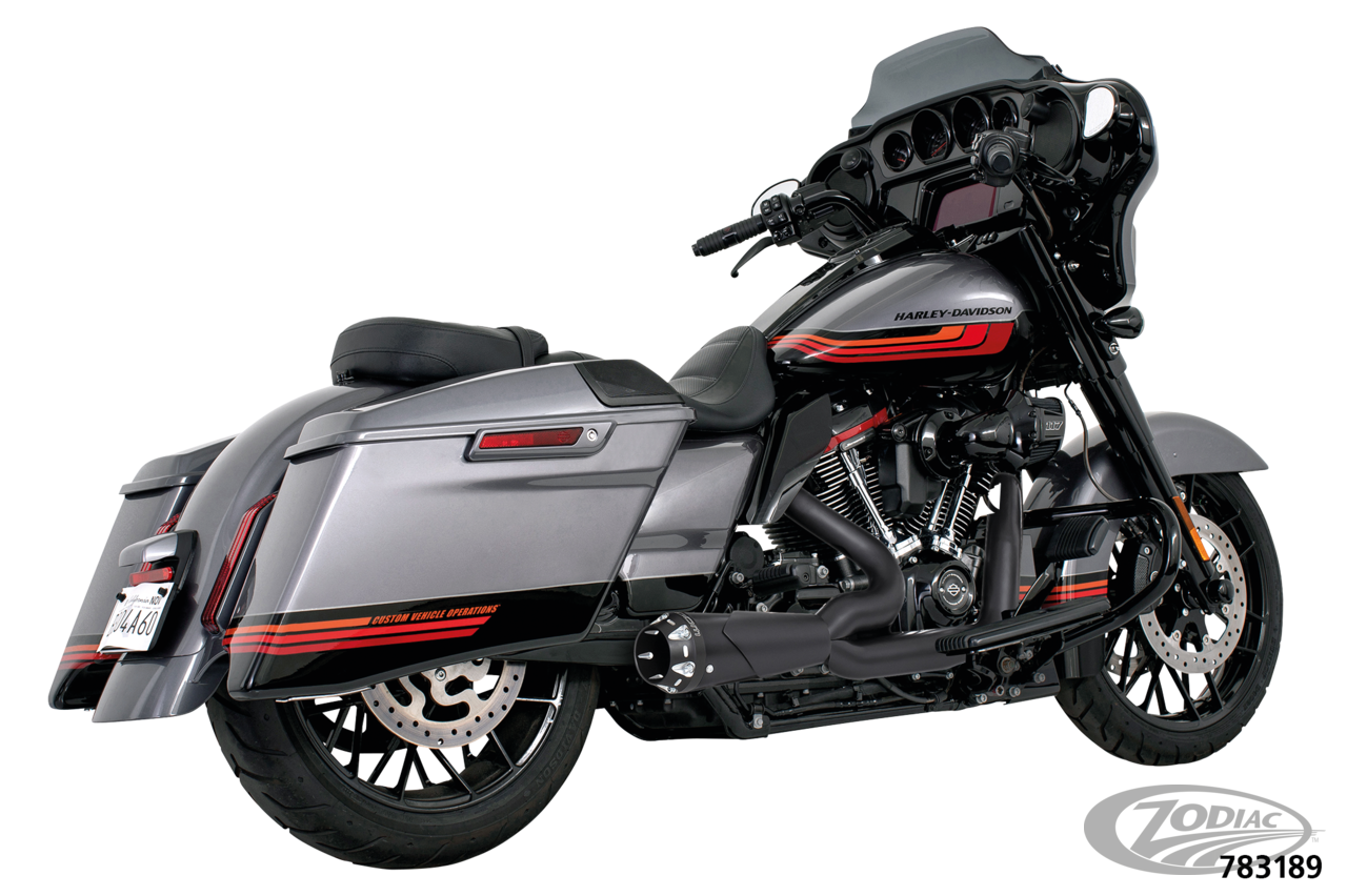 FEATURES & BENEFITS •Triple stepped headers 1 3/4" to 1 7/8" to 2" for increases of 15-18 HP and 13-15 foot lbs. of torque •Mufflers have removable baffles with a deep, rich and throaty sound, optional quiet baffles available •System equals 5 steps throughout for extreme power gains •System reduces heat concentration by 30% •Boasting full-coverage one-piece (220°) blue-proof heatshields (available in chrome or ceramic black) •Customizable with a show chrome, sculpted black or pitch black tip •Includes O2 sensor ports, plugs and all mounting hardware •Engineered for maximum power! •All 2021 and later European models (Euro 5) require eliminators ZPN 744444 for the rear O2 sensor and digital tuning with Diag4Bike or similar to disable related CEL (Check Engine Light) and DTC's (Digital Trouble Code) •Made in USA
