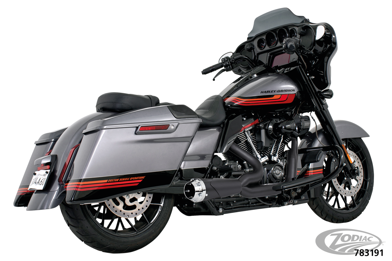 FEATURES & BENEFITS •Triple stepped headers 1 3/4" to 1 7/8" to 2" for increases of 15-18 HP and 13-15 foot lbs. of torque •Mufflers have removable baffles with a deep, rich and throaty sound, optional quiet baffles available •System equals 5 steps throughout for extreme power gains •System reduces heat concentration by 30% •Boasting full-coverage one-piece (220°) blue-proof heatshields (available in chrome or ceramic black) •Customizable with a show chrome, sculpted black or pitch black tip •Includes O2 sensor ports, plugs and all mounting hardware •Engineered for maximum power! •All 2021 and later European models (Euro 5) require eliminators ZPN 744444 for the rear O2 sensor and digital tuning with Diag4Bike or similar to disable related CEL (Check Engine Light) and DTC's (Digital Trouble Code) •Made in USA