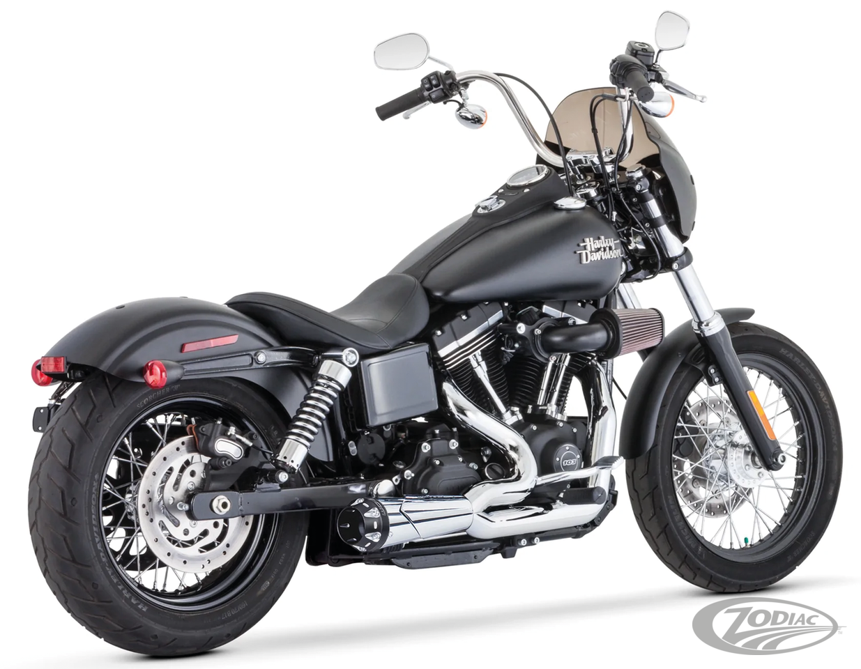 FEATURES & BENEFITS •Triple stepped headers 1 3/4" to 1 7/8" to 2" for increases of 15-18 HP and 13-15 foot lbs. of torque •Mufflers have removable baffles with a deep, rich and throaty sound, optional quiet baffles available •System equals 5 steps throughout for extreme power gains •System reduces heat concentration by 30% •Boasting full-coverage one-piece (220°) blue-proof heatshields (available in chrome or ceramic black) •Customizable with a show chrome, sculpted black or pitch black tip •Includes O2 sensor ports, plugs and all mounting hardware •Engineered for maximum power! •Made in USA