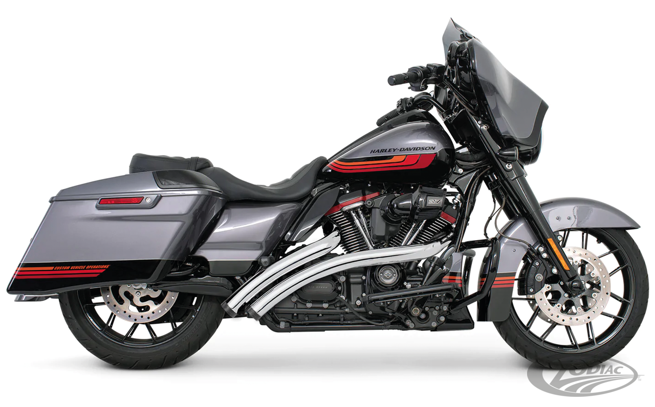 FEATURES & BENEFITS •Performance collector for maximum power and torque •1-piece full length heat shields prevent chipping, rust and peeling between sections •Large 2 1/2" 16 gauge heavy duty 220º blue proof shields available in chrome or black hi-temp finish •Exhausts have billet endcaps and removable baffles, optional Quiet Baffles available •O2 ports & plugs provided for early models •Complete with mounting hardware and brackets •Unmatched sound & performance