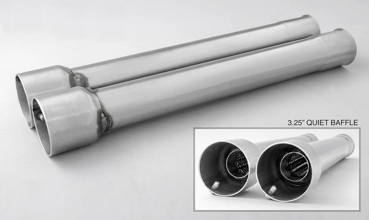 FEATURES & BENEFITS •Mufflers that fit stock headers •Choice of distinctive styling billet end tips in either Chrome or Black finish •Race version exhausts have removable baffles with acoustic packing for deep rich tone, optional quiet baffles available •Complete with mounting hardware and brackets •Easy installation using stock mounting brackets