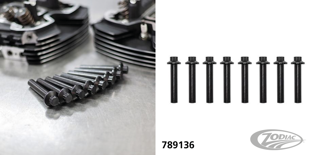 These reusable heat treated 8640 steel bolts have a 200,000 psi Ultimate Tensile Strength, 14% stronger than stock. They feature a durable Black Oxide coating, 9/16" 12-point heads with integral washer, formed threads and cold formed heads. Also available including 4140 Chrome Moly tempered steel cylinder studs with 180.000 PSI tensile strength. Fits all Milwaukee Eight engines 2017 to present.