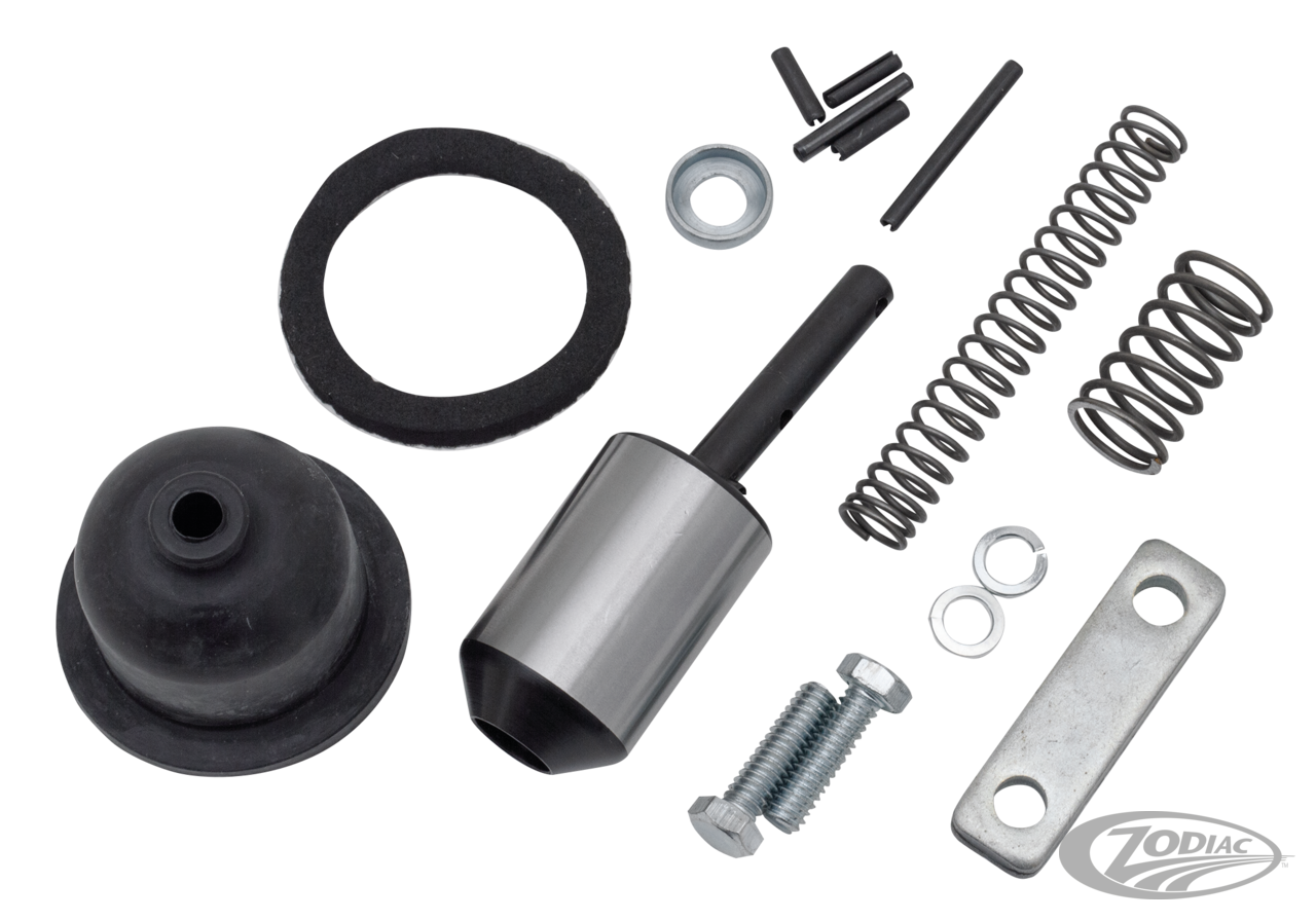 Solenoid plunger assembly kit includes plunger boot, plunger, plunger shaft, retainer, springs, spacer, mount gasket, pins, screws, and lock washers. Fits 1967-1980 Sportster, 1982-1988 FXR, 1965-1984 FL, 1971-1984 FX, 1984-1988 FXST, 1979-1988 FLT and 1986-1988 FLST.