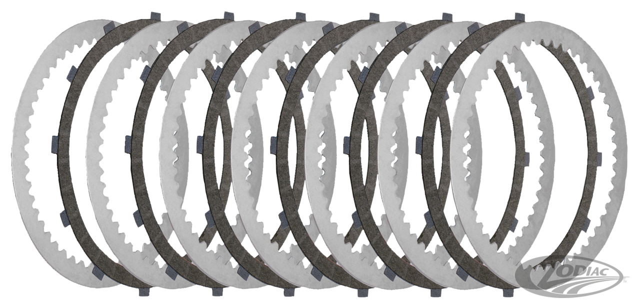 Fits 5-speed Big Twin late 1984-1989, run wet or dry, Set of six friction plates with tempered steel cores and seven steel drive plates. High performance kit with 25% increased clutch surface (OEM 37930-84 & 37975-84)