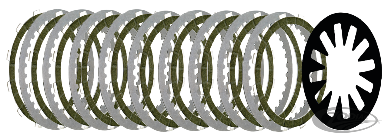 Fits 1998-2000 Evolution Big Twin and 1999-2017 Twin Cam, except those with "Assist & Slip" clutch, High Performance kit with 10% increased clutch surface. Set of ten friction plates with 6061-T6 aluminum cores, nine steel drive plates and a 10% stronger than stock diaphragm spring