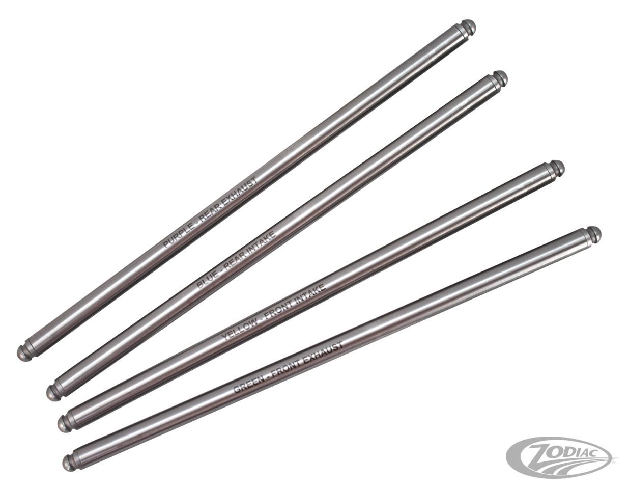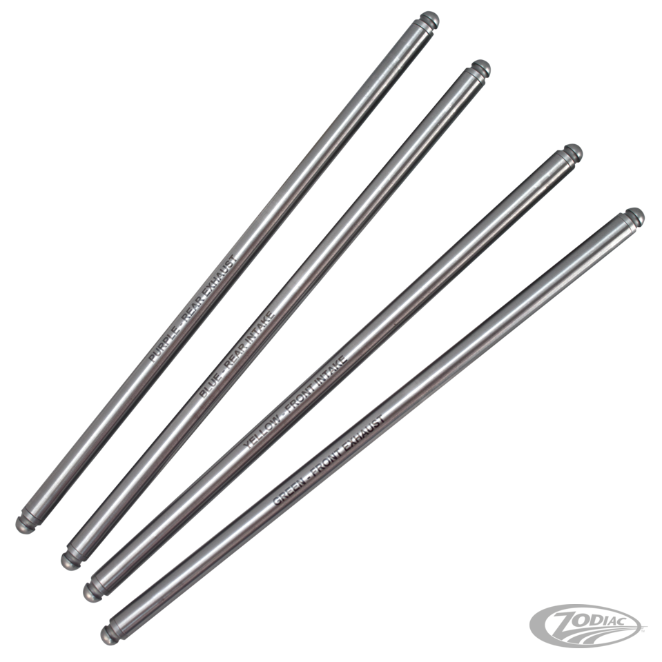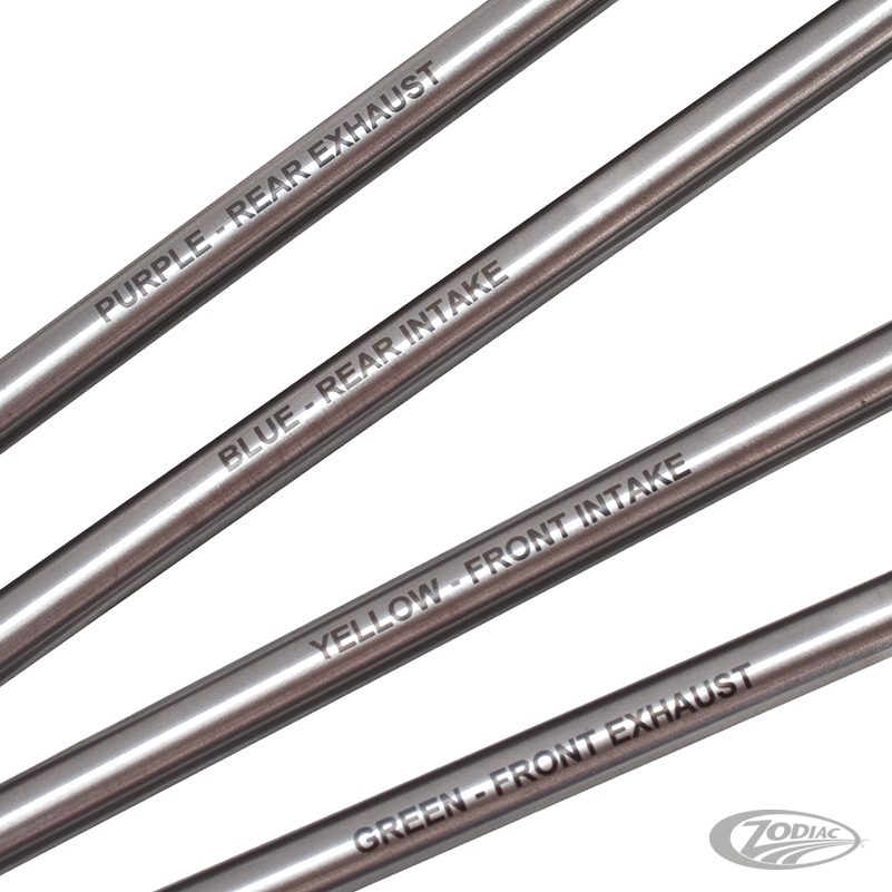 Non-adjustable pushrods made from 7/16" high strength chromoly steel tubing for increased strength. Marked with the stock color code and valve position for ease of installation. Replaces stock pushrods perfectly. (OEM 17921-83 rear exhaust 11.210", 17924-83A rear intake 11.045", 17927-83A front exhaust 11.325", 17930-83A front intake 11.090").