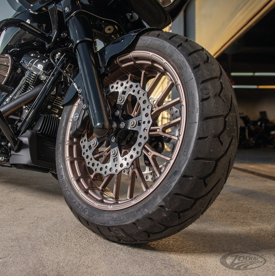 11.8" (300mm) spoke mounted front disc fits Touring 2014 to present and Trike 2014 to present with 5-spoke cast wheels5-Lug disc has 300mm outer diameter and 138.5mm inner diameterDiscs is fitted floating using the OEM bolts, bushings and wave washers, Jagged design floating disc