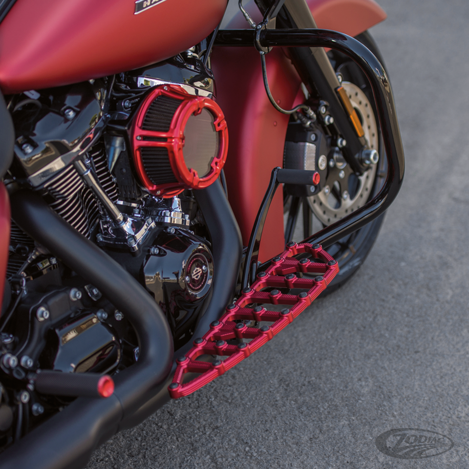 The Ness MX floorboards feature a detailed cut-through design with integrated rubber inserts for excellent foot traction. CNC machined from a solid block of billet aluminum, with extended length for added foot room and comfort. Driver floorboards are 18" (45.8cm) long and 5 3/4" (14.6cm) wide. Passenger floorboards are 8" (20.3cm) long and 4 1/4" (10.8cm) wide.