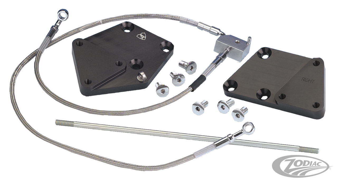 Moves factory foot controls 3" forward to increase leg room. Includes black anodized billet aluminum adapter plates, extended stainless steel rear brake line, extended shifter rod, kickstand spring pin and necessary hardware.