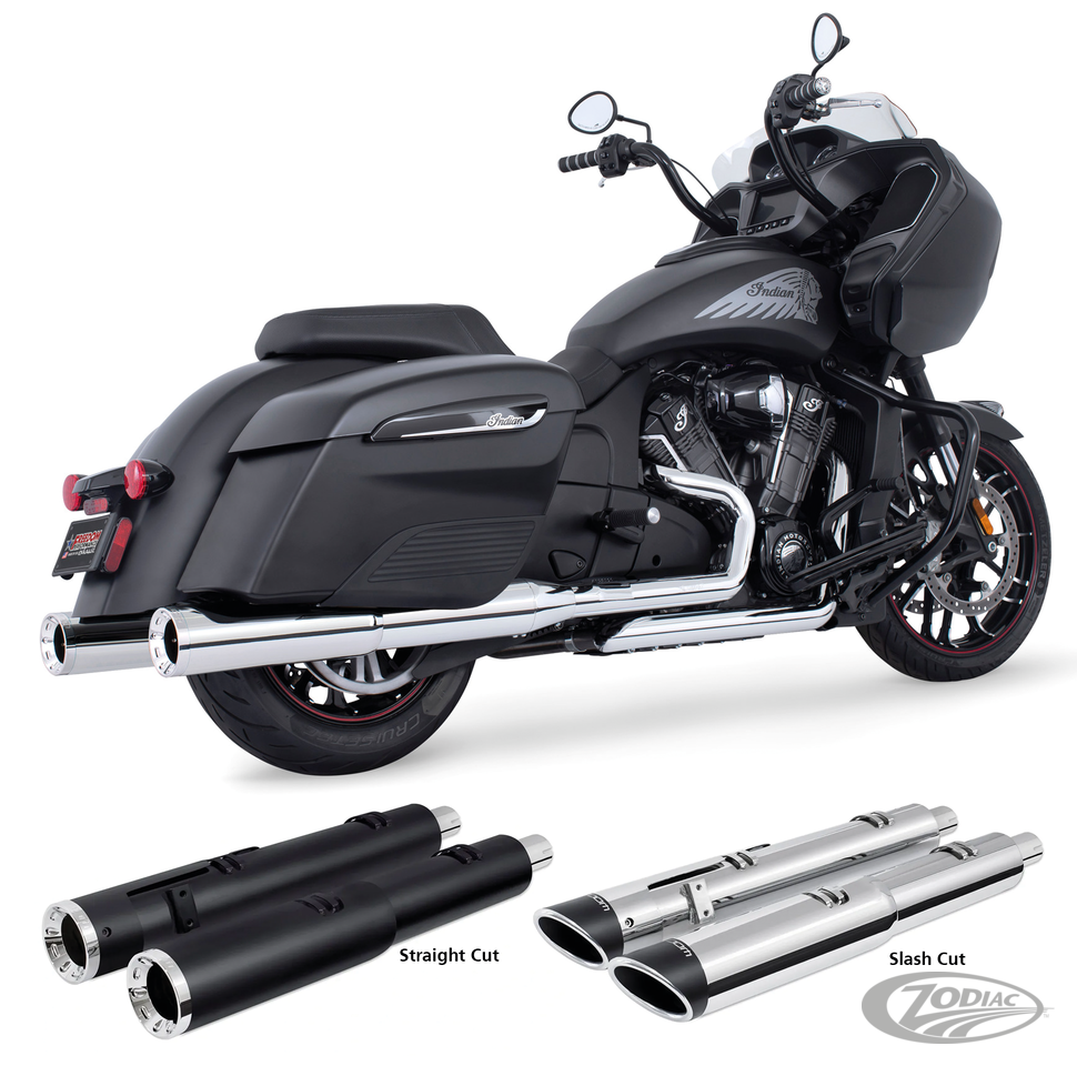 Fits Chieftain & Roadmaster 2014 to present, Springfield 2016 to present, Challenger 2020 to present and Pursuit 2022 to present, Chrome with black Slash Cut end caps