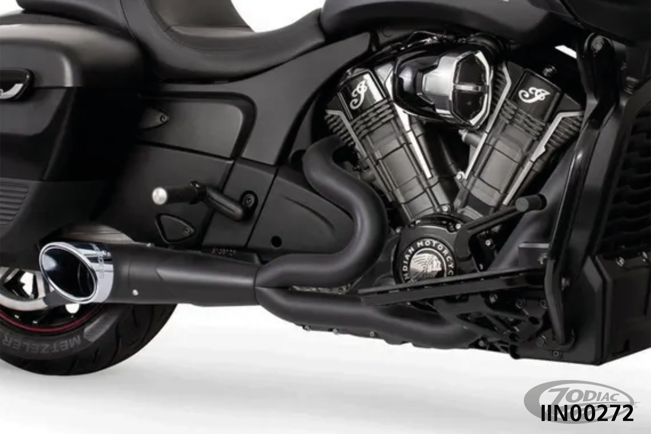 Fits 2020 to present Indian Challenger and Pursuit. Has no provision for the third O2-sensor on 2023 to present International Export models (EURO-5), Black Turn-out 2-into-1 with chrome Slash Cut end cap