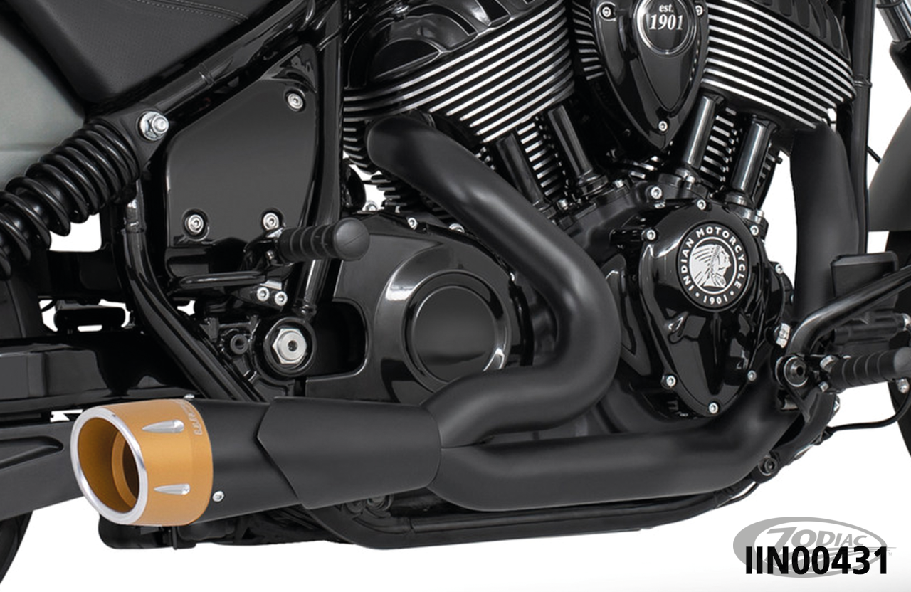 Fits 2022 to present Indian Chief Bobber, Chief Classic, Chief Dark Horse, Chief Standard, Chief Vintage and Super Chief, Black Combat Shorty 2-into-1 with sculpted gold Fluted end cap