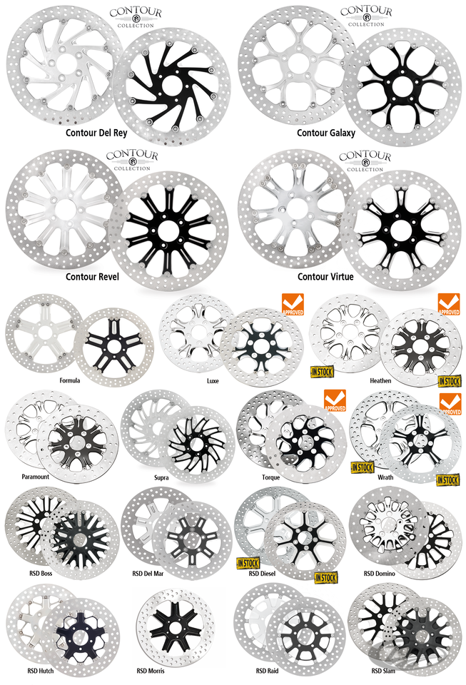 ● 13" (330mm) front discs are oversized compared to stock and must be used with caliper adapter brackets or brake calipers for this disc diameter ● 13" (330mm) front discs are NOT available with chrome rotor carriers ● All front discs are drilled 5 x 5/16" x 3 1/4" for use on PM wheels only ● All rear discs are drilled 5 x 3/4" x 3 1/4" for use on PM wheels only ● It is strongly recommended to install new brake discs with new brake pads