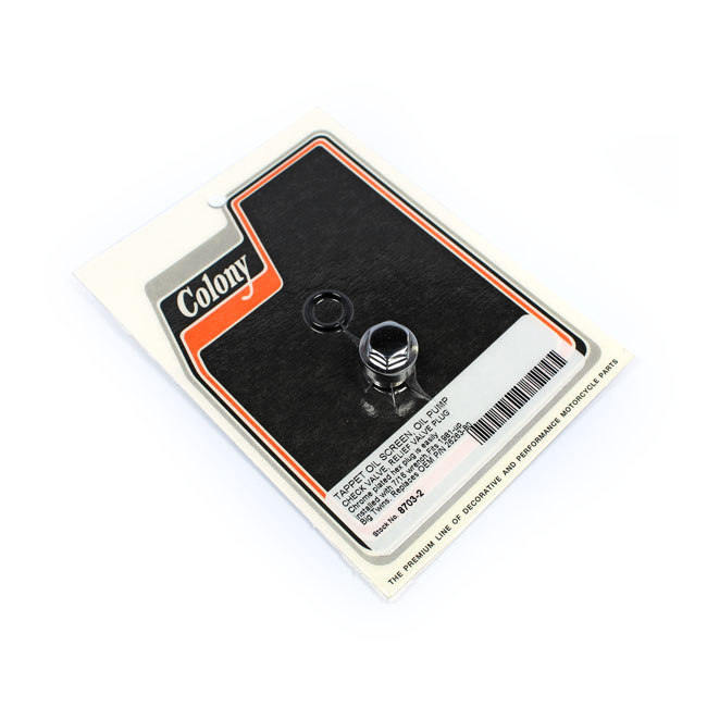 Colony, hex plug oil pump & crankcaseChrome. Hex head. Fits oil screen; check valve and relief valve.