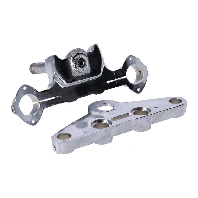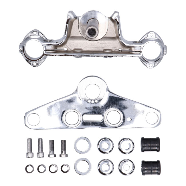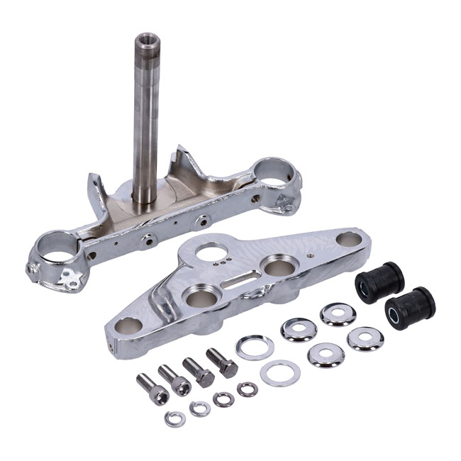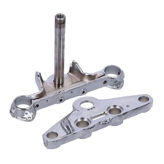 Fits as stock replacement. Lower slider covers and stock headlamp housing can be used. Accepts late model handlebar dampers and riser clamps with standard 3-1/2" spacing. Built-in 2 degree negative rake for more trail. OEM replacement reference 45700-60A