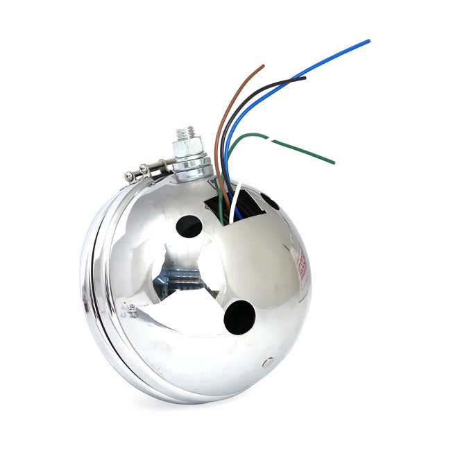 OEM style 5-3/4" FX, FXR, XL headlamp. ChromeChrome; with chrome trim ring. Stock style replacement for the standard early 5-3/4" headlamp assembly. ECE-approved. With a 12V H4 55/60W bulb. OEM replacement reference 67705-74.