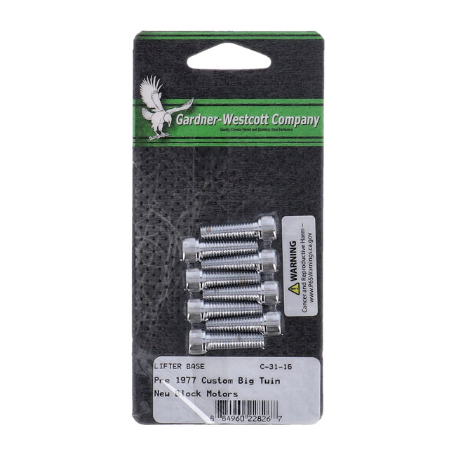 GW, tappet block mount kit. Allenhead, chromeConversion kit. 1/4-24 threaded bolts. Used to fit L76-84 tappet guides to early 36-E76 cases.