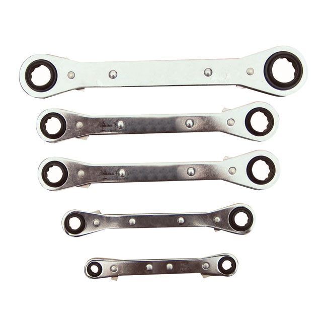 5-piece ratcheting box end wrench set. Latch-on design. On regular accessible bolts a nut can be tightened or loosened up to 5 times faster than with a conventional wrench. This 'latch-on' design features a non-slip retaining ring. This ring prevents the nut/bolt to pass through the tool. Incl. 7x8; 9x10; 11x12; 13x14 and 15x17mm.