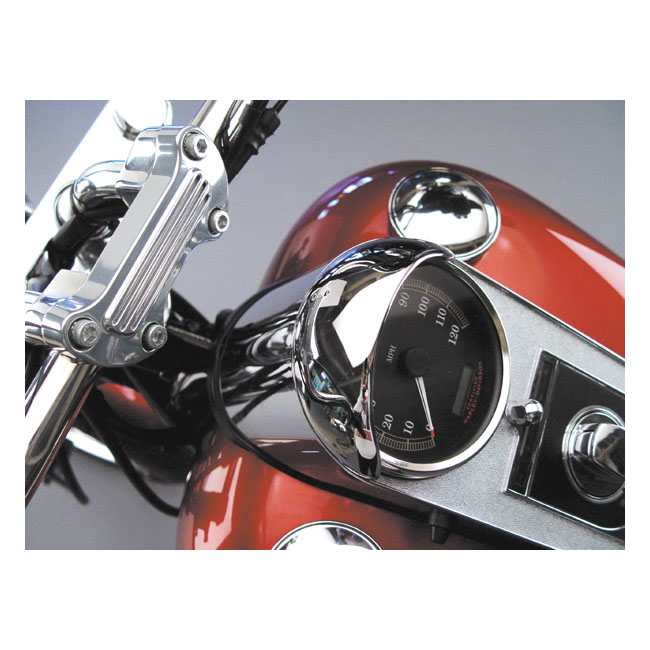 National Cycle, speedo visor. ChromeUSA made. Thick quality chrome plated steel. Fits large FL style speedometers. Includes hardware for installation.