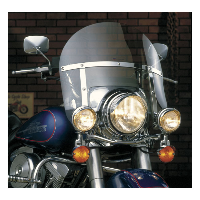 A chopped (lower) version of the 'Touring Heavy Duty™' windshield assembly. Manufactured from clear hard coated Lexan® 4mm polycarbonate material which is ABE approved. Distortion free visibility and scratch resistant. Note: FLHS models can re-use use stock mounting hardware. Compatible with 513661; 513662; 513663 mounting kits